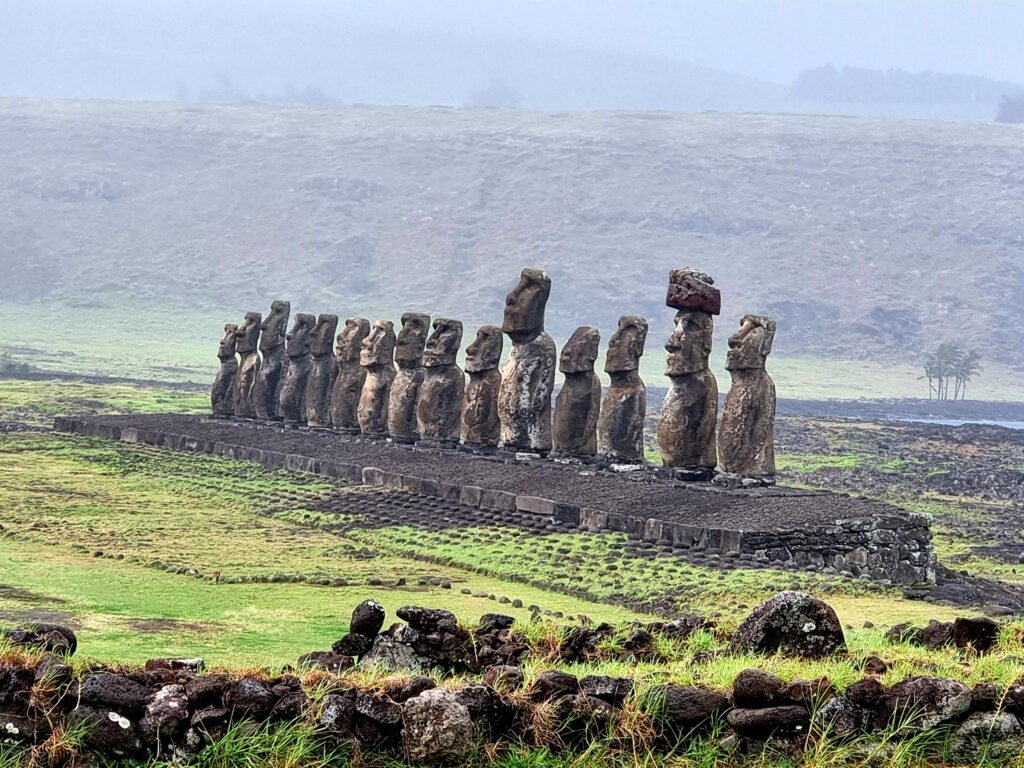Nobody felt like sticking their noses out in a town ravaged by a storm. There was no living soul on the road. It seems we’re alone here, them and us. The guardians of the past. They stand in a row, proudly puffing out their chests. Like soldiers of different stature, there’s the plump one and the skinny one, the tall one and the short one, the one with the helmet and the one who took it off. The fog envelops them all around, and you can hear the neighing of wild horses running on the nearby slopes, the wind carries the roar of foamy waves crashing high into the air. And there we stand in silent awe, Robert and I, holding hands. Our children sleep in the car and miss the moment, but I will remember it for the rest of my life. Us and the moai, the moai and us. Despite the storm, there’s an eerie calmness. Before us, there’s history, but it feels like the present. I feel my heart filled with immense gratitude for being here, for being here and now, finally. Iorana!